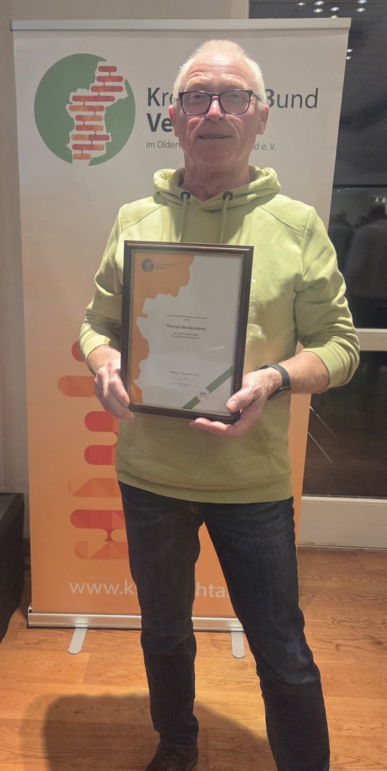 Am Kreissporttag des Kreissportbundes in Osterfeine erhielt Thomas Böckenstette die goldene Ehrennadel des KSB für über 20jähriges ehrenamtliches Engagement. 25 Jahre begleitete er das jährliche Zeltlager, seit 2014 gehört er dem Vorstand als 3.Vorsitzender an und organisiert die Mitgliederverwaltung des Vereins. Darüber hinaus ist er bei Platzarbeiten sowie Reparatur- und Instandsetzungsarbeiten immer fleißig.